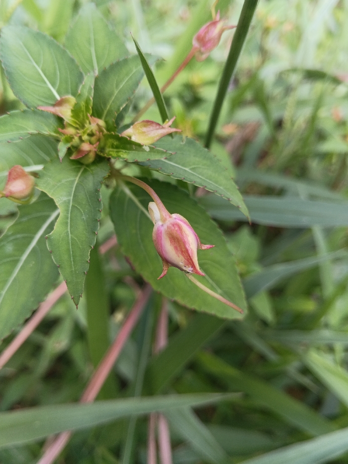 A cluster of green leaves surrounds unopened pink and white flower buds. The pointed leaves have distinct veins. One prominent bud is angled downwards, with its long, slender tip extending towards the bottom right. Other buds and leaf clusters are scattered, with blurred green grass filling the background. The light suggests an outdoor setting.