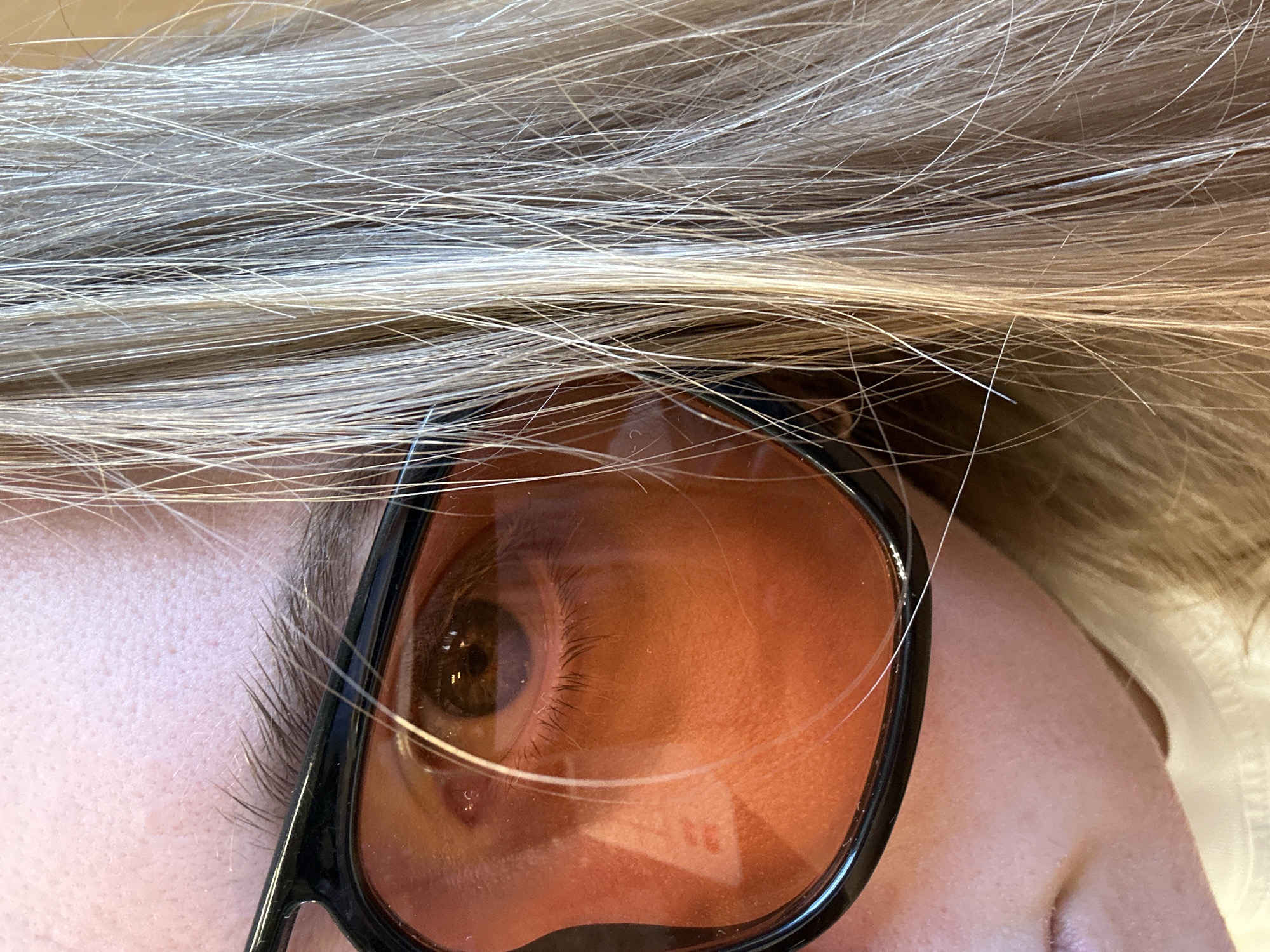 A close-up photographic record from Ural'skoe, Russia, captures the right side of a subject's face. The subject is wearing black-framed glasses with prominent orange-tinted lenses. The visible right eye, dark brown in color, is observed through the lens, displaying eyelashes. The eyebrow, consisting of dark brown hairs, is positioned above the glasses frame on fair skin. Long, straight, light blonde to light brown hair extends down the right side of the image frame. Reflections, including a subtle triangular form, are present on the surface of the orange lens. A segment of the upper cheek and lip area is visible below the eyewear. A light-colored garment is discernible at the bottom edge.