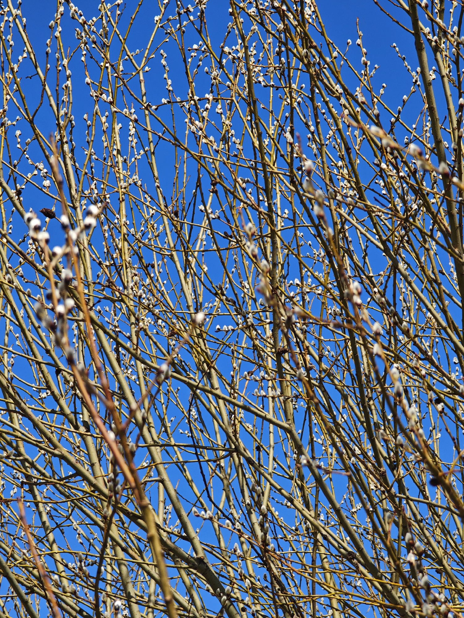 dense network of bare branches against a bright blue sky. Small, white, fuzzy buds are visible on many of the branches. The location is speculated to be in the city of Chaikovsky, Russia, but there is no concrete evidence to support this claim from the image itself. There are no people visible in the image. The primary subjects are the branches and buds of a tree or shrub. The branches are intertwined and create a complex pattern. The environment is a clear, sunny day with a cloudless sky.