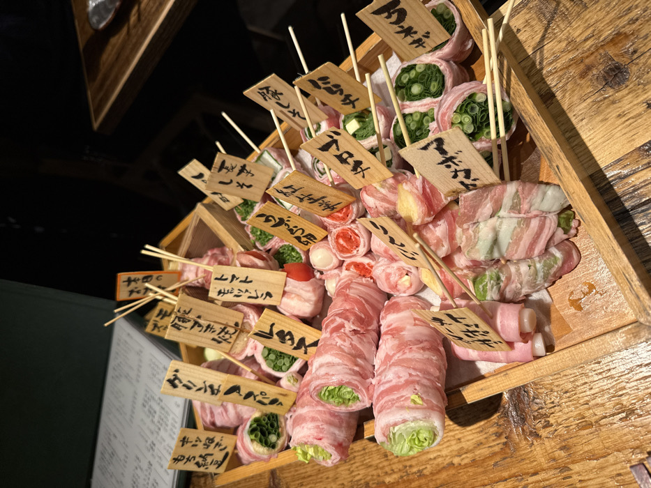 The image presents a close-up, elevated view of an assortment of Japanese-style skewers, known as butabara maki or tonmaki, arranged in a rectangular light-colored wooden serving tray