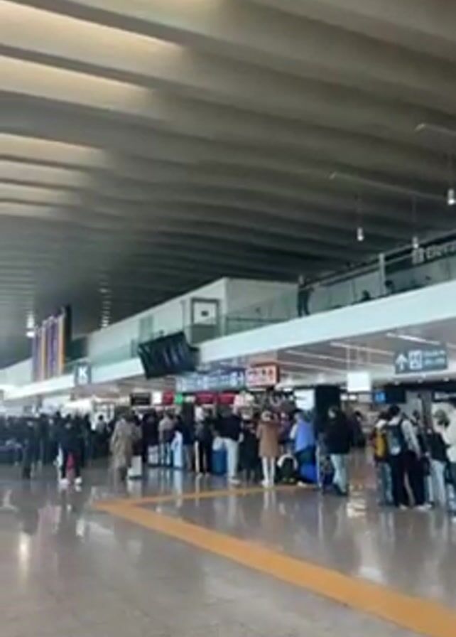 inside of a modern airport terminal with a high, geometrically paneled ceiling. The floor is made of glossy beige tiles, reflecting light and creating a slightly blurred effect. In the foreground, there are several luggage carts, some loaded with suitcases and bags, sitting idle. Further into the terminal, a crowd of people, most of them wearing winter clothing, are gathered around what appears to be check-in counters or security lines. The crowd is dense, and individuals are mostly static, either waiting in line or adjusting their belongings. Above the counters, there are digital screens displaying information, likely related to flight schedules or terminal directions. Large windows are visible on the far side of the terminal, allowing natural light to stream in.