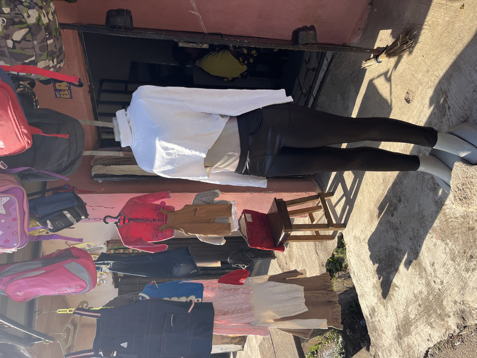 The image depicts an outdoor clothing display in a commercial area, consistent with a street market or small shop in Jos, Nigeria. In the foreground, a headless female mannequin wears a white, cropped turtleneck top and black, form-fitting trousers; its feet rest on a rough concrete block. The ground is concrete, casting shadows from direct sunlight. To the left of the mannequin, a small, dark wooden stool holds a pair of red trousers. A metal bar or line above the display area suspends various garments. From left to right, these include a dark blue denim overall dress, a light blue long-sleeved top, distressed dark denim jeans, a red long-sleeved cardigan, and brown overalls worn over a striped shirt. Below these, a pink knitted top and a white ribbed top over a brown frilled skirt are visible. Several backpacks in pink, black, red, and camouflage patterns hang from an overhead structure. The background features a building painted in a faded reddish-pink hue, with an open doorway revealing a dark interior. A person in a yellow-green top is partially visible inside the doorway. A faint sign above the entrance reads "EL-R" and possibly "2025." A traditional straw broom leans against the building to the right of the entrance.