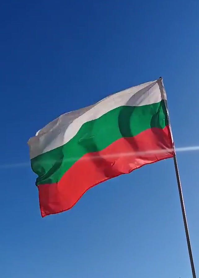 A low-angle shot shows a Bulgarian flag waving against a bright blue sky