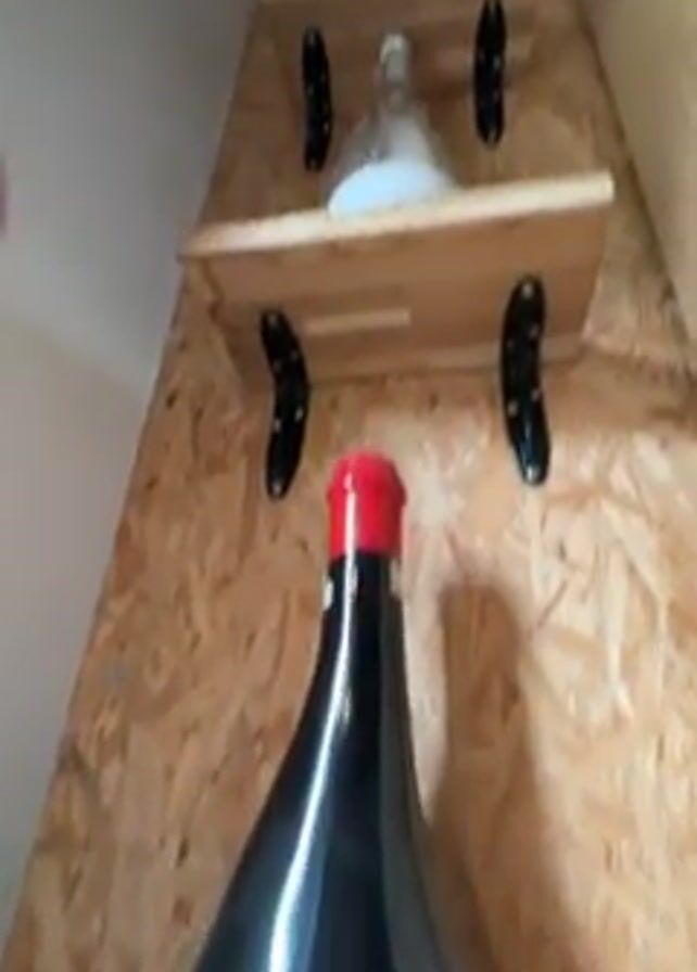 tall, narrow wine rack constructed from light-colored wood and black metal brackets. The shelves are attached to a wall made of oriented strand board (OSB). At the bottom of the rack is a large, oversized bottle of red wine with a red cap. Above it, on the middle shelf, there is a larger bottle of Prosecco. On the top shelf, a small bottle with a white label is placed. The rack is situated near a window with natural light coming in. The camera is angled upwards, focusing on the progression of bottles on the shelves.