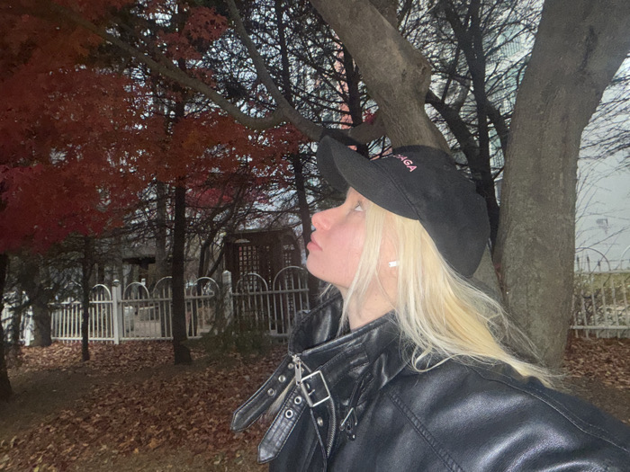 A woman with blonde hair and a black baseball cap is looking up. She is wearing a black leather jacket with silver buckles and zippers. The background includes a tree trunk, red-leaved trees, and a white fence surrounding a building. The ground is covered with fallen leaves. The lighting suggests it is dusk or a cloudy day.