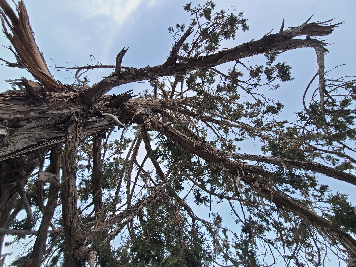 A low-angle shot captures a gnarled, leaning tree against a blue sky with wispy clouds. The tree's thick trunk and branches display peeling bark, with numerous smaller branches covered in dense, dark green needles. Some branches are broken and bare, revealing splintered wood. The tree appears old and weathered, its form twisted and reaching towards the sky.