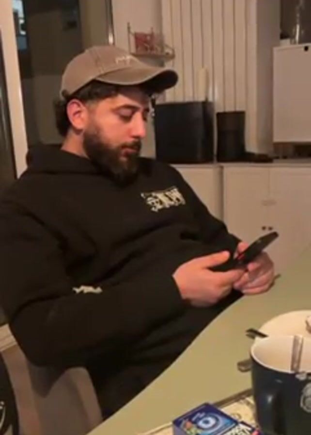 A man with a beard and a cap, wearing a black hoodie, is sitting at a table. He is looking at a smartphone in his hands and manipulating it with his fingers. On the table in front of him, there is a mug, a paper plate with a spoon, a single dollar bill, and a small blue box with an eye design. The background includes a partially visible window on the left, white cabinets and a cylindrical black object against the wall in the center, and a white shelf-like unit to the right.
