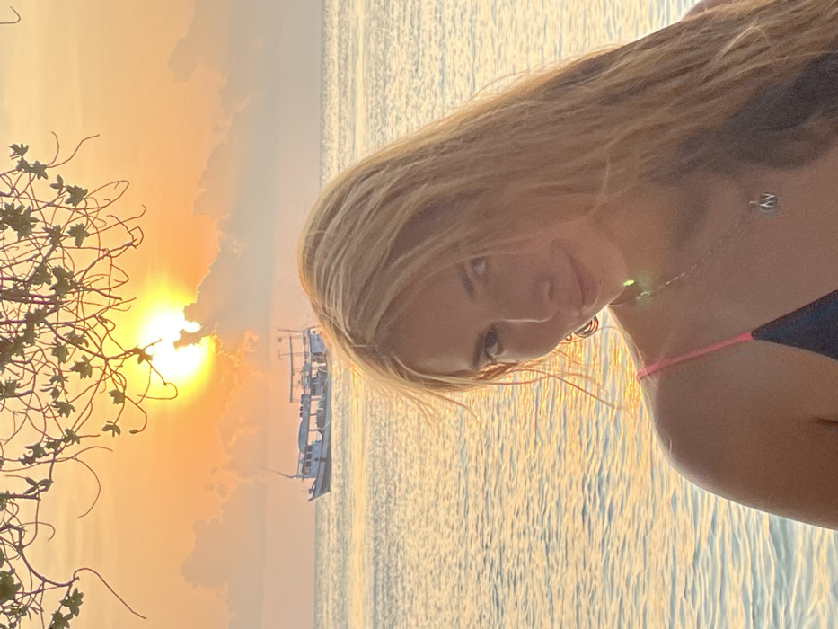 A portrait-oriented photograph depicts a female subject at sunset on the coast of Ko Tao, Thailand. The woman, positioned in the foreground, has long, light blonde hair partially swept by wind, wears a dark-colored swimwear top with a visible pink strap on her right shoulder, a silver-colored necklace with a circular initial pendant, and hoop earrings. She is looking directly at the camera with a subtle smile. The background displays a golden-orange sunset over calm water, with a white two-tiered boat visible in the mid-distance. Silhouetted tree branches with sparse foliage partially obscure the sky in the upper left quadrant of the image.