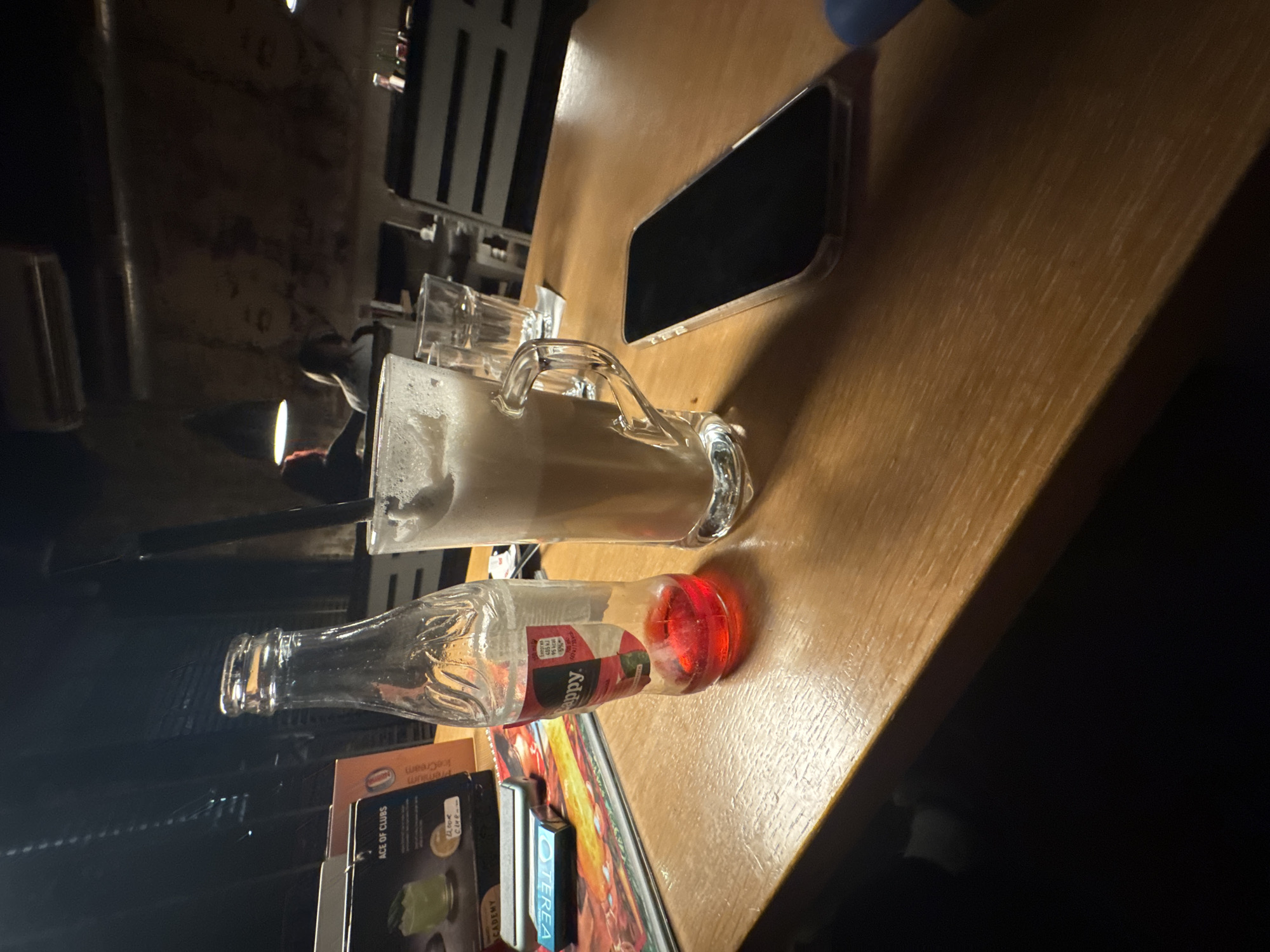 The image depicts the interior of a dimly lit cafe or bar located in Pleven, Bulgaria. The central focus is a wooden tabletop, on which several items are arranged. To the left, a standing menu card displays "ACE OF CLUBS" and other text. Adjacent to it, a small, clear glass bottle, labeled "Happy," contains a red liquid, approximately half-full. To the right of the bottle, a tall, clear glass mug with a handle holds a light brown, frothy beverage, likely a coffee drink, with a black straw inserted. Behind this mug, an empty, clear drinking glass is visible. Further right, a black smartphone in a clear protective case lies face down on the table. Partially visible behind the "Happy" bottle is a blue and silver rectangular box, consistent with an IQOS TEREA tobacco product pack, resting on a printed mat or menu. The background shows a dark, textured wall, possibly brick or concrete, illuminated by warm light from hanging pendant fixtures. Two blurred figures are discernible in the mid-ground, seated or standing at a distance, one with visible reddish hair and another with lighter hair. No specific actions or interactions are clearly visible from the individuals.