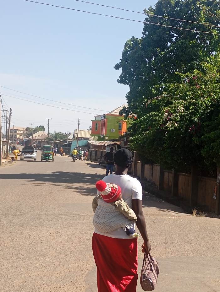 A street scene in Jos, Nigeria, is depicted on a clear, sunny day. The primary subject, a person, is viewed from behind, walking away from the camera on a paved road. This individual wears a white short-sleeved top, a long red skirt, and a dark head covering. A baby is carried on the person's back, secured by a white patterned fabric wrap. The baby is dressed in a red and white knitted hat with a pompom and a light-colored long-sleeved garment, with blue footwear visible on the left foot. The person carries a brown patterned handbag in their left hand. The road, appearing as light-colored asphalt, features prominent shadows. In the distance on the left, a silver or light-colored sedan and a green Keke Napep (tricycle taxi) are visible, traveling in the same direction. Additional figures and vehicles are further down the street. Buildings line the left side of the road, including a multi-story structure with distinct green, orange, blue, and white vertical stripes. Overhead power lines and utility poles are distributed along the street. On the right side, a large, dense-foliage tree with some pink and white blossoms stands alongside a low wall that parallels the road.