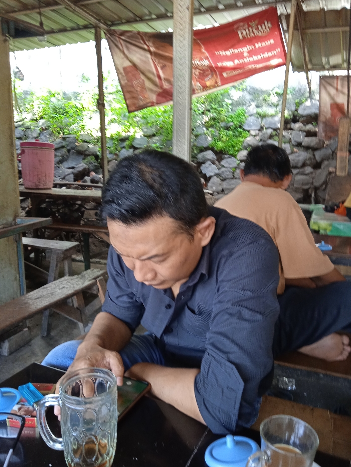 A man in a navy blue shirt looks at his phone while seated at a table outdoors. A glass mug with liquid inside is on the table next to his phone. Behind him, another man is seated, wearing a tan shirt and with bare feet. In the background, there's foliage, stone, and red and brown banners hanging from the roof of the structure where they sit. The setting appears to be a simple outdoor cafe or rest area.