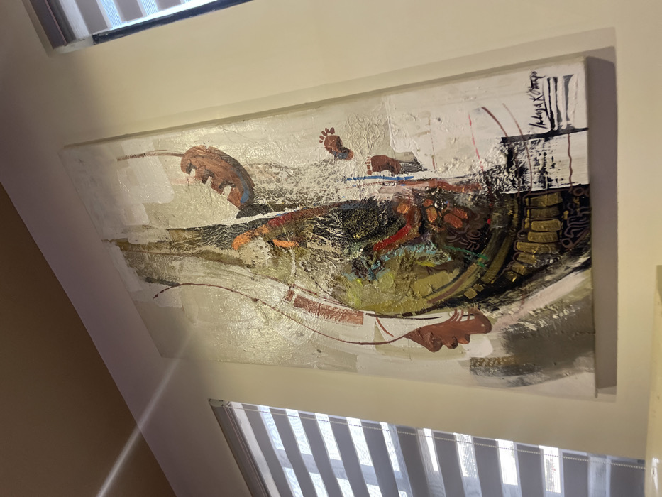 Abstract painting featuring human-like forms and textures. Shades of brown, green, red, and gold combine, giving the piece depth and movement. Apparent are crude, textured footprints, a human head silhouette, and patterned shapes. A vertical signature is visible in the upper right, indicating an artist. The piece hangs on a white wall between two window frames, both with venetian blinds, implying indoor illumination.