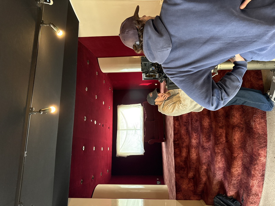 Two people stand in a room with deep red carpet and walls. The walls have evenly spaced silver rings. A window is covered with white plastic. A black wall with a multi-bulb light fixture is visible. One person wears a blue hoodie and jeans while the other wears a tan jacket and jeans. A camera sits on a stand in the center. The room is decorated with white trim.