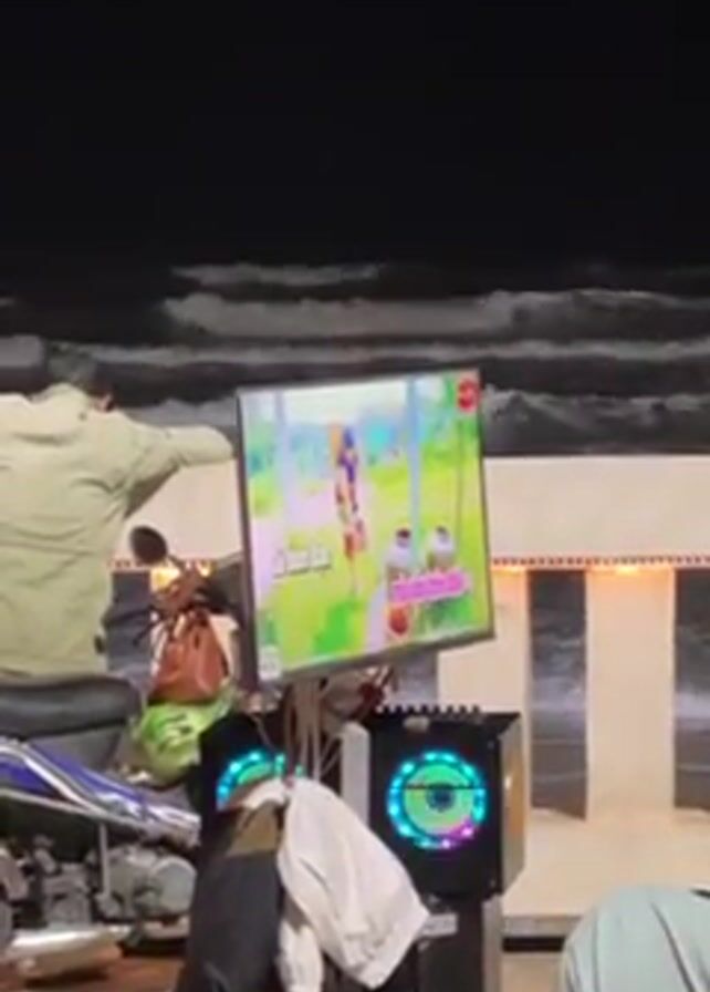 A group of people are enjoying karaoke at an outdoor venue. A man stands to the side near a parked motorbike, while another man faces away from the camera, possibly watching the performance. The karaoke system includes a monitor displaying lyrics and visuals, and a speaker with a light display. In the background, a structure designed to mimic a beach scene includes a painted backdrop of waves. People stand on a raised platform singing into a microphone. The scene is at night and illuminated by lights.