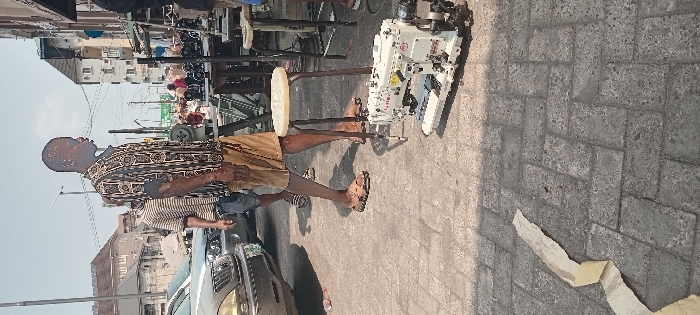 The image captures an outdoor street scene within a commercial district in Aba, Nigeria, under bright daylight
