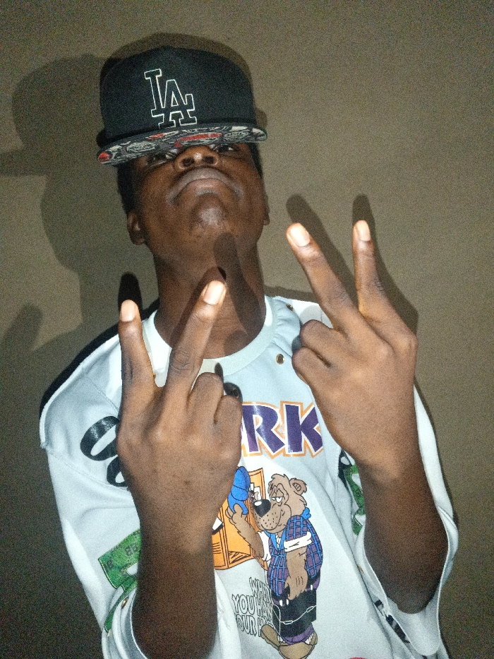 A dark-skinned person wears a black LA baseball cap tilted back. The person's head is tilted back, and the nose is visible under the cap's brim. Both hands are raised, displaying the peace sign. The person wears a white t-shirt with a cartoon bear graphic and the letters "ORK." The background is a plain, light brown wall, with a shadow visible behind the person. The lighting is somewhat dim and grainy.