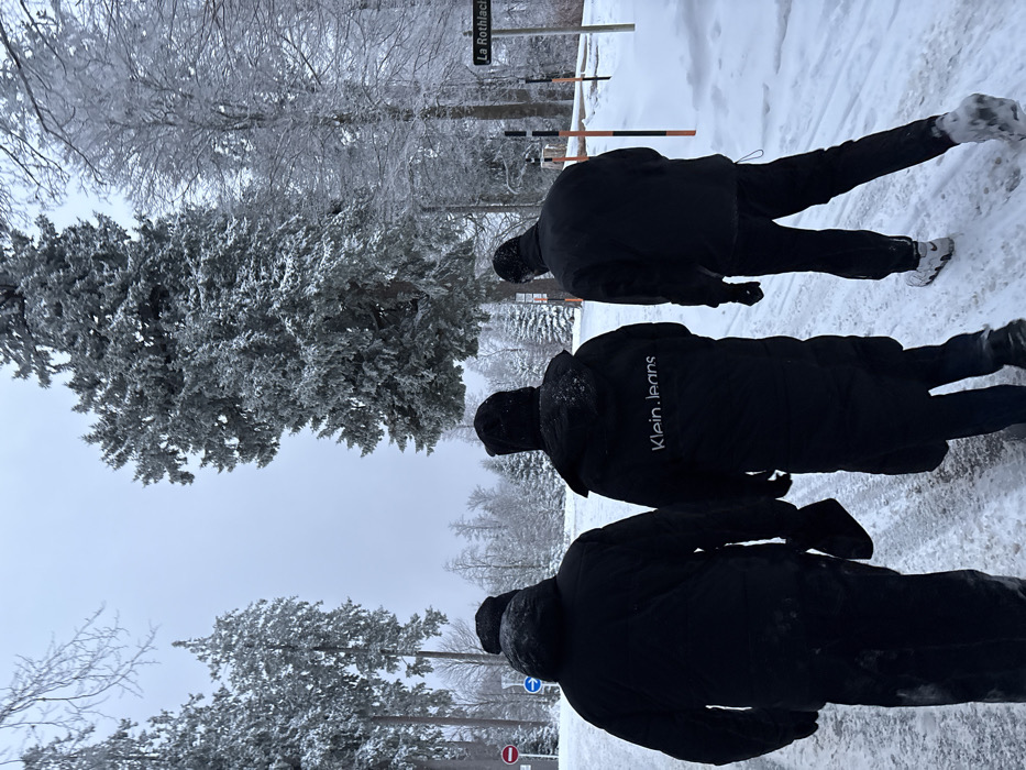 Three individuals walk away from the camera on a snow-covered path in Le Hohwald, France. The path is bordered by snow-laden evergreen and deciduous trees under an overcast sky. The person in the center wears a black winter coat with "Klein.jeans" visible in white text on the back. To their left, another individual wears a plain black winter coat, while the person on the right wears a black jacket and pants with white sneakers. On the left side of the path, a red circular 'no entry' sign and a blue circular 'mandatory right turn' sign are partially visible. On the right, a street sign reads "La Rothlach" and several orange and black striped poles stand upright in the snow. The ground is uniformly covered in snow, and tree branches are heavily frosted.