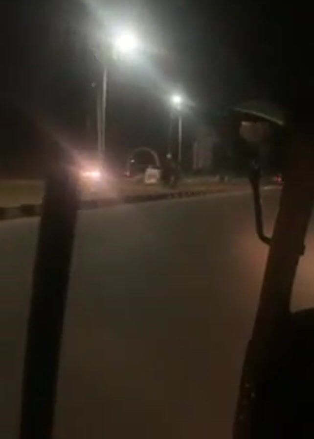 The video is shot from a moving vehicle, likely a rickshaw or tuk-tuk, at night. The perspective is from the inside, looking forward. The road is asphalt, illuminated by streetlights. A structure, possibly a monument or large building, can be seen in the distance and to the right. There are vehicles with headlights visible further down the road. The rickshaw's frame is visible in the foreground, partially obstructing the view. The overall scene is dark, with limited visibility due to the low light conditions.
