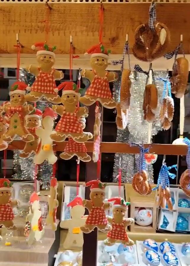 Christmas market stall. The stall displays various Christmas ornaments hanging from a wooden beam. There are gingerbread men with different designs, pretzels, and blue and white ornaments. The gingerbread men include ones wearing red and white checkered dresses with Santa hats, ones wearing a scarf with "STRASBOURG" printed on them, and plain gingerbread man shapes. The pretzels are hanging on blue and white ribbons. The background shows more ornaments, gifts, and other market decorations, giving the scene a festive and cheerful atmosphere. The stall is well-lit, enhancing the colors and details of the ornaments.