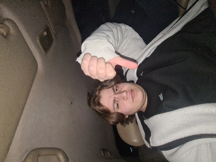 Within a vehicle interior in Barza Municipality, Syria, a young adult male is depicted seated, making direct eye contact with the camera. The subject has medium-length brown hair and a stud piercing on the left nostril. He wears a black long-sleeved shirt with a small logo on the chest, layered under an open light gray jacket featuring black trim. The subject's right arm is raised, with the hand clenched into a fist and the thumb pointed downwards. The vehicle's interior features a beige headliner, a visible sunroof, and an overhead grab handle. A light-colored seat or headrest is partially visible behind the subject's left shoulder. The scene is dimly lit, indicative of an interior or nighttime setting.