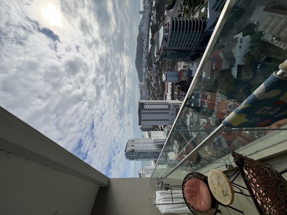 This image depicts an elevated outdoor scene from a balcony overlooking Vung Tau City, Vietnam, a coastal urban environment. The perspective is high-angle, looking out towards a cityscape, the ocean, and a prominent green mountain range under a partially cloudy sky. In the foreground, the balcony features a light grey wall on the left. A brown wicker armchair with a light pink cushion is visible on the lower left. Adjacent to it is a small, round, light-colored wooden table with a slightly worn surface. Below the table, part of another wicker furniture piece is visible. A white metal clothes drying rack with several white garments, likely shirts or towels, hangs towards the left. A glass and metal railing extends across the middle ground, separating the balcony from the city view. A blue, yellow, and white patterned towel or mat hangs draped over the metal handrail of the railing, slightly obstructing the immediate downward view. The midground reveals a dense urban landscape characterized by numerous high-rise buildings. On the left, closer to the coastline, a tall, distinctive high-rise with a rounded, undulating facade is prominent. Further right, other multi-story buildings line the coast. Below these taller structures, a tightly packed area of lower-rise buildings with predominantly red-tiled roofs and various colors spreads across the landscape. A large, modern, curved glass building, identifiable as the Pullman Vung Tau Hotel, stands prominently on the right side of the midground. Roads and visible infrastructure weave between the buildings. The background features an expansive body of water, the sea or ocean, visible along the horizon towards the left and stretching into the distance. A large, tree-covered mountain or hill range dominates the far right side of the background. The sky is largely covered with various altocumulus or stratocumulus clouds, creating a bright but overcast atmosphere, with the sun partially visible as a bright glare in the upper right quadrant. No individuals are visible within the scene.