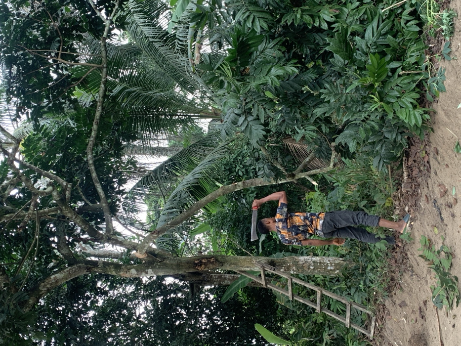In Ikot Ete Ekpo, Nigeria, a young male individual is observed from behind, standing on an unpaved dirt path amidst dense tropical vegetation. He wears a short-sleeved t-shirt with a multi-colored geometric pattern (orange, black, yellow) and dark grey trousers rolled up to mid-calf, with blue open-toed slides on his feet. His right arm is raised, holding a long-bladed machete with a red handle horizontally over his head/shoulder, appearing to be in an active or preparatory stance. To the left of the individual, a large tree trunk is visible, against which a wooden ladder with multiple rungs is propped vertically. One prominent branch of this tree appears freshly cut, indicating recent felling or trimming activity. The ground in the immediate foreground and to the right is covered with an accumulation of freshly cut green leaves and branches, consistent with vegetation clearing. The background consists of a thick canopy of various trees, including what appears to be a tall palm tree, under an overcast sky. The scene suggests manual labor related to clearing or harvesting in a rural or natural environment.