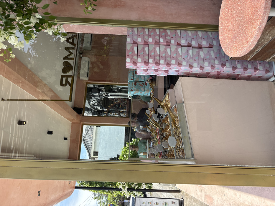 A storefront displays the word "ROMA" vertically, with a heart symbol replacing the "O." Inside, boxes stacked high bear the words "ROLLED WITH LOVE." A display case showcases food items with gold-colored stands. Reflections in the window reveal people inside and foliage outside, including white flowers. Black lighting fixtures are visible along the top of the store.