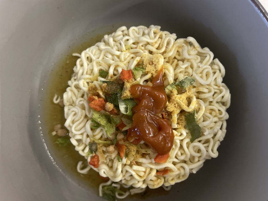 - "The image presents a close-up, top-down view of a serving of instant noodles in a gray bowl" by FM-NoKcg2, licensed under CC BY 4.0