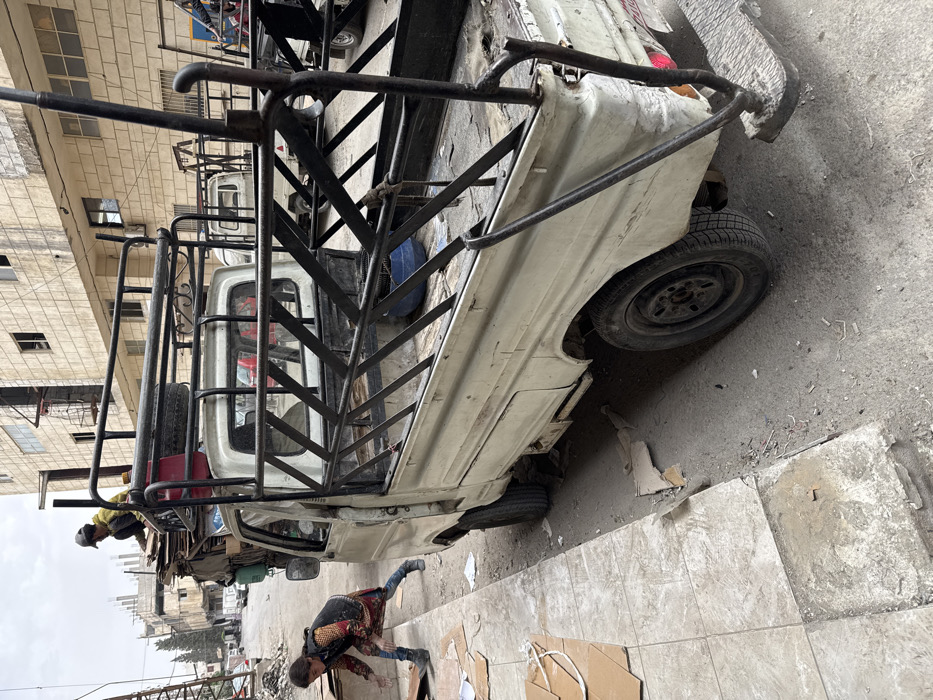 white pickup truck parked on a narrow, paved street. The truck is facing the right of the image, its rear facing the viewer. The truck bed has a black metal framework. A woman is picking up discarded cardboard boxes on the ground in front of the truck. The truck appears to be loaded with discarded cardboard boxes and wood. A taller building with many windows is visible in the background, indicating this is a residential area. Based on the coordinates provided (33.444, 36.277), the location is likely a street in the city of Sbeneh, Syria.