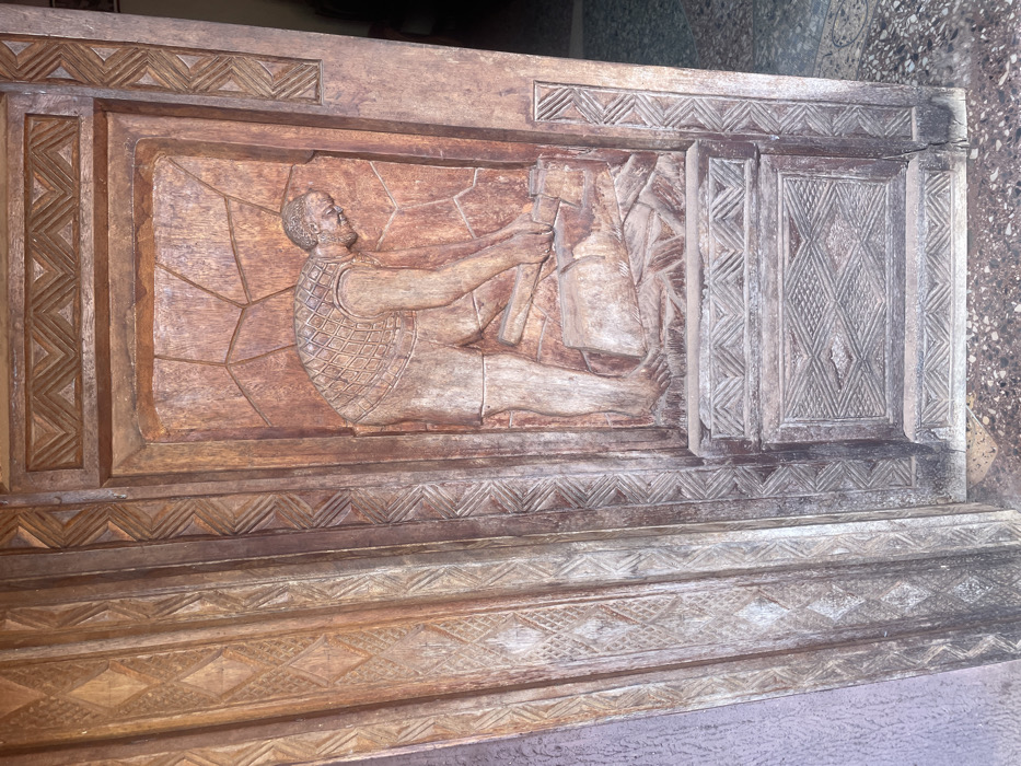 The image showcases a detailed wood carving. A muscular figure, possibly a man, is prominently displayed, lying on his side and appearing to manipulate objects. The figure wears a patterned vest and is set against a background of radiating lines. The carving incorporates geometric patterns along the edges and within the frame. The wood appears aged, with some discoloration and signs of wear.