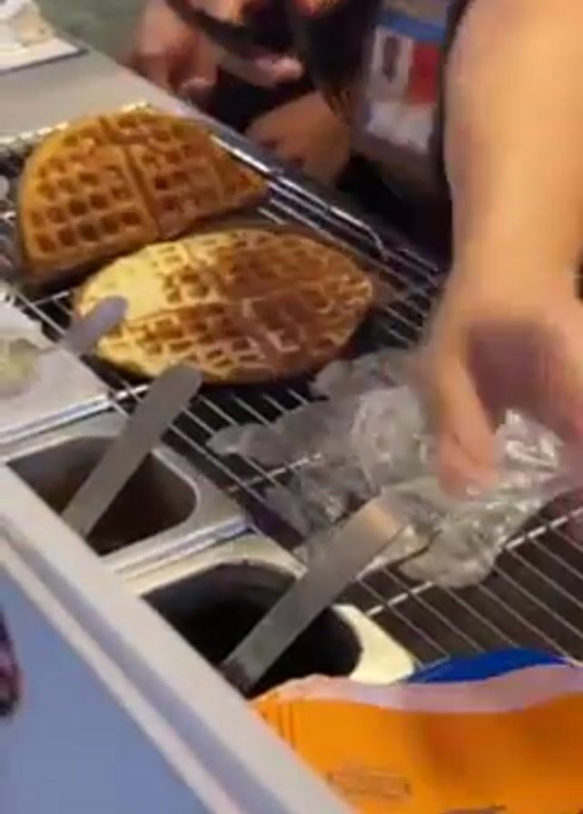 - "Here's a concise description of the video: Two workers at a waffle stand prepare waffles" by FM-7eaFY2, licensed under CC BY 4.0