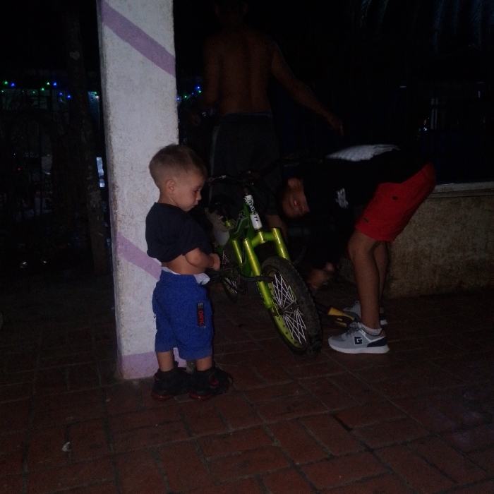 A young child in a black shirt and blue shorts stands with exposed stomach near a white pillar with a light purple stripe. Nearby is a green bicycle. An adult male with no shirt and dark shorts stands behind the child and bike. To the right, another person in a black shirt and red shorts bends over near the bike. The scene appears to be outdoors, on a brick surface with dark lighting.