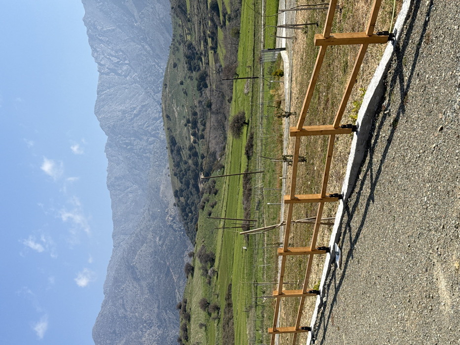 The image displays a rural landscape near Alonia, Greece, under a clear blue sky with minimal scattered white clouds. In the foreground, a light brown gravel surface is visible, partially obscured by a newly constructed wooden split-rail fence. This fence consists of light brown wooden posts and two horizontal rails per section, with the posts anchored by black metal bases to a low, light grey concrete curb. Shadows from the fence components are cast onto the gravel and concrete, indicating direct sunlight from the upper right. Beyond the fence, the midground features an expanse of green and dry brown vegetation, possibly fields or pastures, with visible undulating terrain. Several thin, dark vertical poles, consistent with utility poles or agricultural supports, are interspersed throughout this area. Scattered small, bare trees and shrubs are present, along with a solitary, larger leafless tree positioned towards the center-right of the midground. The background is dominated by a vast range of grey, rugged mountains, exhibiting distinct rocky formations and ridgelines that stretch across the entire upper portion of the image, meeting the clear blue sky. No individuals or specific actions are observed.