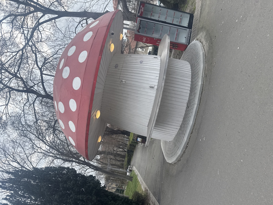 - "The image displays an outdoor scene in Burgas, Bulgaria, featuring a prominent mushroom-shaped kiosk situated within a park environment, identified as the Sea Garden, under an overcast sky" by FM-n82oC2, licensed under CC BY 4.0