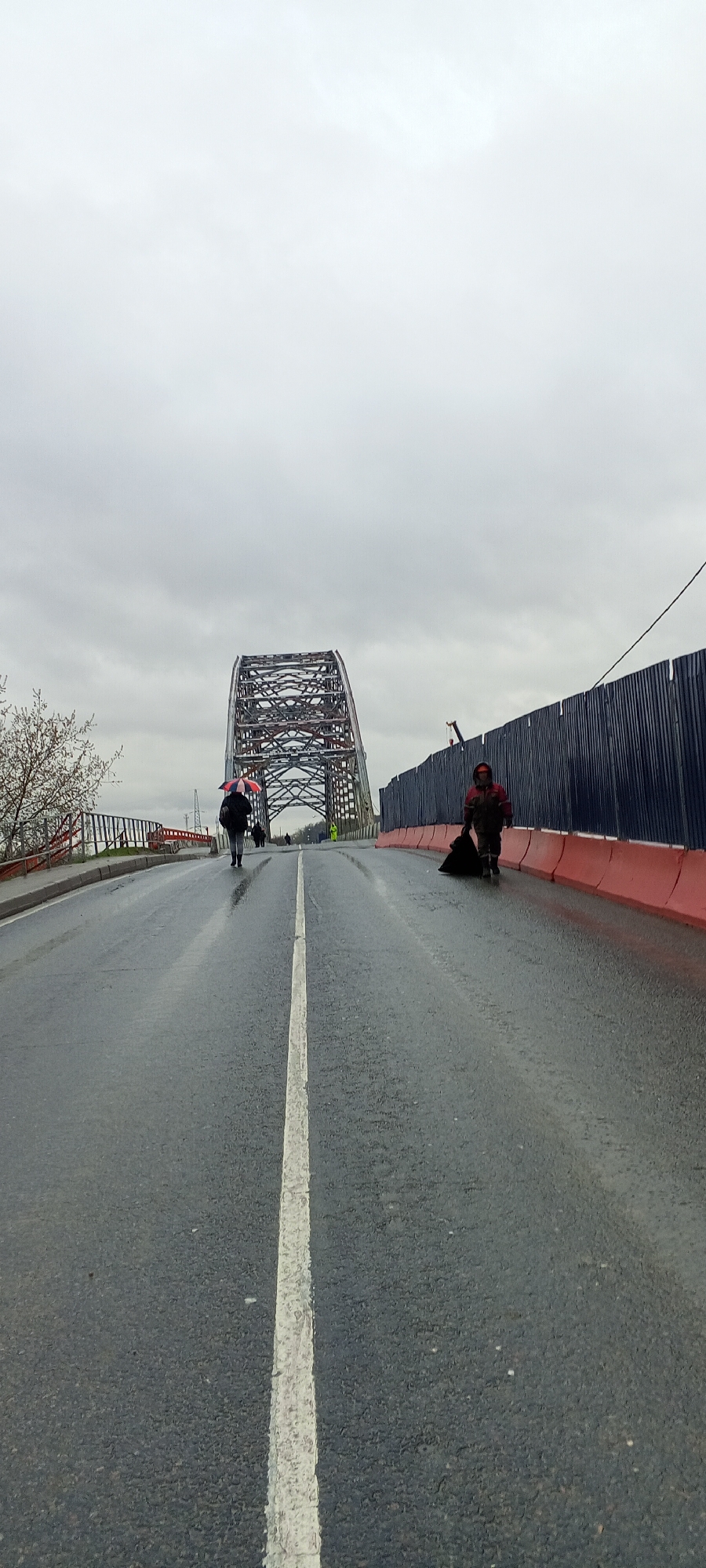 The photo captures a rainy day on the Dmitrov bridge in Dmitrov, Russia. The asphalt road is wet and reflective, divided by a white center line. A metal arch bridge structure is visible in the background. On the right side of the road is a blue corrugated fence with an orange base. A person in a red hooded jumpsuit is walking towards the photographer carrying a black bag. Another person with an umbrella is walking in the opposite direction. The sky is overcast. A few bare branches of a tree can be seen on the left.