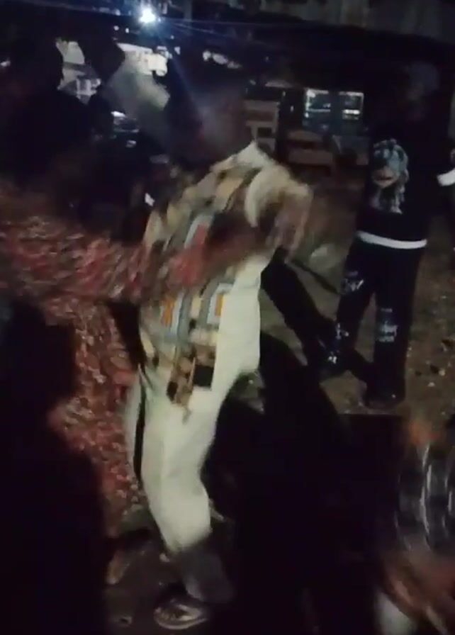 group of people dancing outside at night. A woman in a floral dress and a man in a patterned shirt and white pants are dancing together in the center. Other people are standing around watching and moving to the music. The environment is dark with some artificial lighting. The video is somewhat shaky.