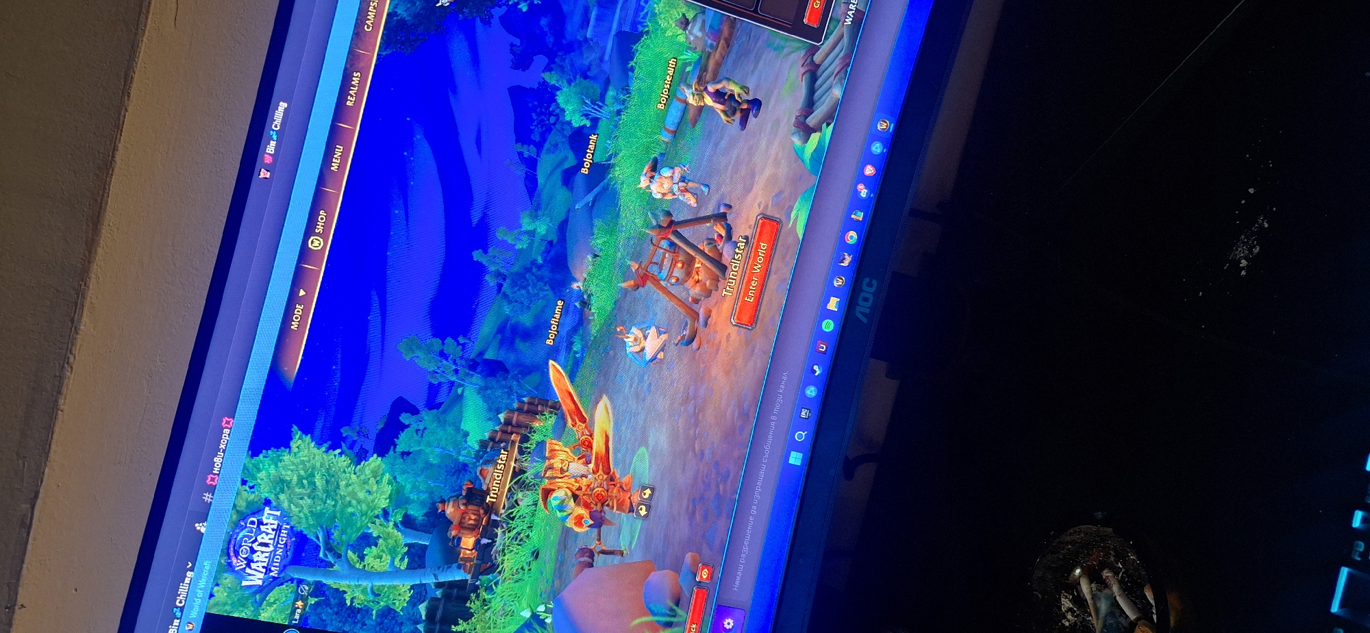 A close-up photograph shows a computer monitor displaying the World of Warcraft Midnight loading screen. The user's profile name is "Bin Chilling" and the game is in "Chilling" mode. The scene is a loading screen featuring different player names such as "Bojoflame", "Bojotank", and "Bojostealth" near their avatars. The "Enter World" button is visible, suggesting the user is about to start playing. The bottom taskbar shows various icons, including the World of Warcraft icon and other programs. To the right of the monitor is a dark area with some debris, possibly food crumbs. There are no people visible, nor indications of a location in Varna, Bulgaria.