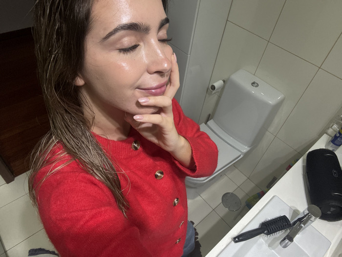 The image displays a high-angle view of a female subject in a residential bathroom, located in Nogueira e Silva Escura, Portugal. The female, positioned centrally and seen from the chest up, has her eyes closed and exhibits a subtle smile. Her dark brown hair appears wet and lies against her shoulders. She wears a red, textured long-sleeved top with three gold-colored buttons visible on the front. Her left hand is raised, with manicured fingers gently touching her chin and jawline. Her skin appears moist and reflective. In the background, a white ceramic toilet with a top-mounted dual-flush system is visible to the right, adjacent to white rectangular wall tiles. A white toilet paper roll is mounted on the wall above the toilet. In the bottom right foreground, a white rectangular sink basin contains a silver single-lever faucet and a black cylindrical hairbrush resting on its rim. A black electronic device and a small blue and white bottle are present on the countertop surface to the right of the sink. The floor is tiled with light-colored square tiles, and a circular metal drain cover is partially visible. A dark brown vertical surface, possibly a door or cabinet, is present on the far left. A white cabinet unit is partially visible behind the toilet on the left side of the frame.