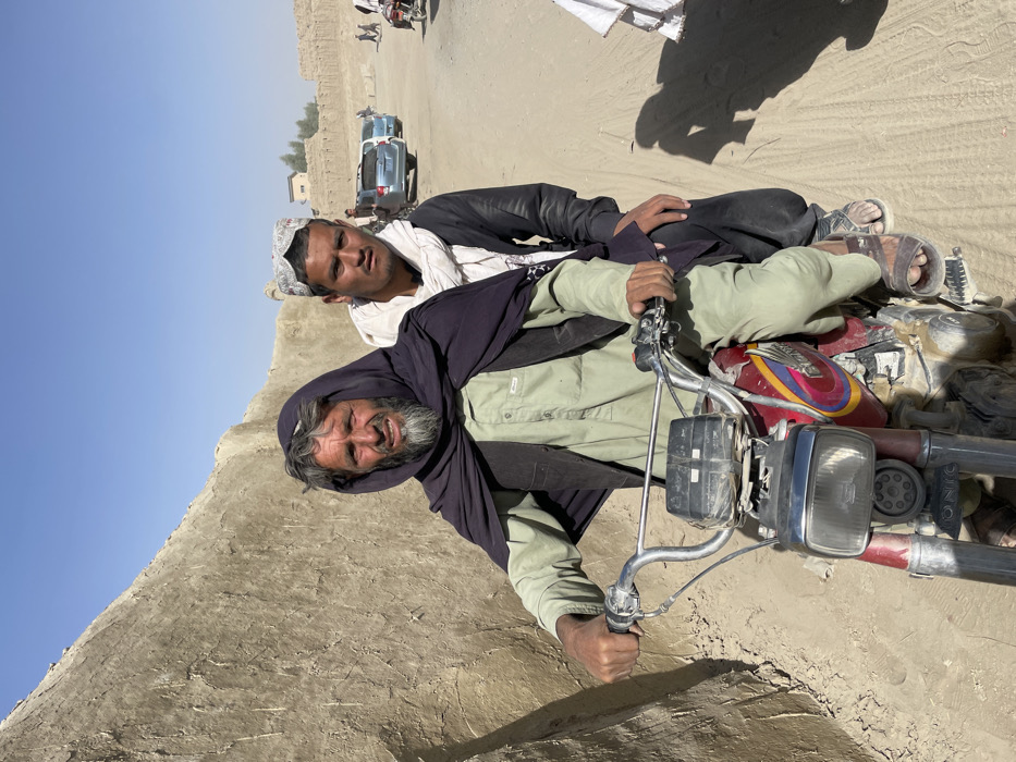 In Spin Boldak, Afghanistan, an adult male with a gray beard, wearing a dark hooded shawl over a light olive-green tunic and pants, operates a dusty, red and chrome motorcycle. His hands grip the handlebars as he looks towards the viewer. Seated behind him is a younger adult male wearing a white skullcap, a white scarf, and dark attire, with his right hand resting on the driver's back. The motorcycle is positioned on a dirt road. To the left, a tall, textured mud wall rises. The background features a wide, dusty expanse with parked vehicles, including a light blue SUV, and several individuals walking or standing. Further structures of similar mud construction are visible under a clear, bright blue sky, indicating an arid, sunlit environment.