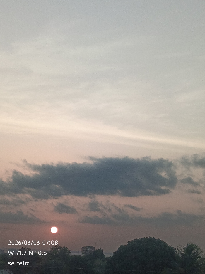 The image, captured at 07:08 on March 3, 2026, from coordinates W 71.7 N 10.6, depicts an outdoor scene in Maracaibo, Venezuela, overlooking Lake Maracaibo. A bright, circular orange-red sun is visible just above the horizon, partially obscured by a dark, horizontal band of clouds stretching across the middle of the sky. The upper sky displays a gradient from light grey-blue to pale pink, with sparse, wispy clouds. Below the sun and cloud band, a dark body of water, indicative of Lake Maracaibo, is visible. The foreground consists of dense, dark green foliage and trees, with a large, rounded tree dominating the lower right. No individuals or discernible objects beyond the natural landscape are present. The text "se feliz" is superimposed on the lower left.