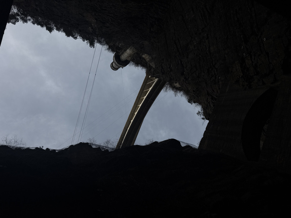 The image depicts a view looking upwards from the base of a deep, narrow gorge in Pellafol, France, under an overcast sky. Two towering, dark rock faces frame the scene, largely silhouetted, with some sparse vegetation visible along their upper edges. A modern, light-colored concrete arch bridge spans the gorge high overhead, its underside and supports visible against the sky. Below and to the left of this bridge, a section of a dark, older stone archway is visible, suggesting a lower passage or structure within the gorge. On the right side, a tall, cylindrical concrete tower structure, possibly an intake tower or part of a dam, rises from the gorge wall towards the main bridge level. Multiple thin cables or power lines traverse the gorge horizontally above the main bridge. Portions of the left rock face exhibit what appear to be protective netting or screens. No people, vehicles, or animals are visible.