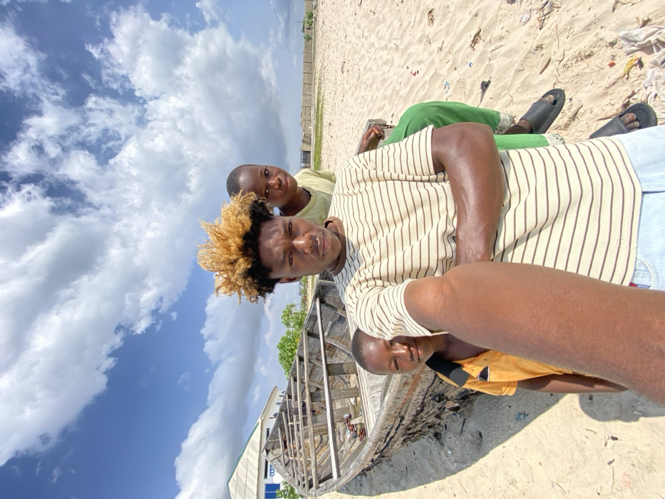 A daytime photograph depicts three males posing for a selfie on a sandy beach in Alaguntan, Nigeria