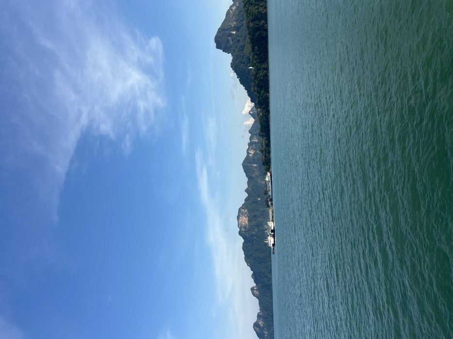 The image displays a coastal scene in Don Sak, Thailand, under a clear, bright blue sky with scattered wispy white clouds, predominantly on the right. The foreground consists of a body of green-blue water exhibiting surface ripples. In the midground, a chain of large, verdant limestone mountains, covered in dense tropical foliage, stretches horizontally across the frame. Exposed rock faces are visible on some mountain peaks. At the base of these mountains, approximately center-left, a ferry terminal is visible. Two large, white multi-decked ferry boats are docked at a concrete pier extending into the water. A third, smaller white vessel is docked closer to the shoreline, further to the right of the main pier. Buildings are discernible along the shoreline adjacent to the terminal. On a prominent island or mountain mass to the far right, a small, white, pointed structure, resembling a pagoda or stupa, is situated amidst the trees on a slope. No individuals or specific actions are discernible in the scene.