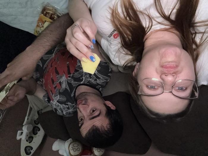 The image displays two adults, a female and a male, situated in an indoor environment, specifically a private residence in Sofia, Bulgaria. Both individuals are reclining on dark brown upholstered furniture, likely a sofa or bed, and are looking towards the camera with pursed lips, presenting a playful expression. The female is in the foreground, positioned on the left. She has light brown hair and wears light-colored, cat-eye framed glasses. Her attire consists of a white t-shirt bearing a red lip print and the text "BESTIES." Her left hand, featuring a silver-colored ring on the ring finger and fingernails painted yellow with blue floral accents, holds a yellow, irregularly shaped food item, possibly a piece of cheese or fruit. The male is positioned behind and to the right of the female. He has dark hair and is wearing a dark t-shirt patterned with light-colored leaves and red design elements. His left hand is holding a similar yellow, irregularly shaped food item, from which a portion appears to have been consumed. His right hand is partially obscured, suggesting it may be holding a mobile device. The background reveals additional dark brown upholstered cushions. Visible objects include several plush toys (white, light blue, brown) resting on the furniture. To the far right, a white decorative object with heart patterns, possibly a board or stand, has a white mug hanging from it. A transparent plastic bag containing snack items, resembling nuts, is visible on a light-colored surface near the male's arm. The scene conveys a casual, relaxed domestic setting.