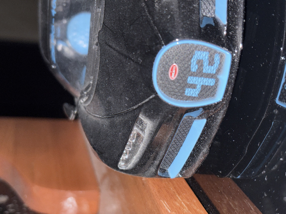 The scene depicts a detailed, close-up view of the front-left quarter of a black model car, identified as a Bugatti, featuring light blue accents and the number "42" on its front grille. The model car exhibits visible dust accumulation on its matte black bodywork, including the bonnet, front fender, and headlight housing. The car's left headlight assembly, comprising multiple clear lenses, is prominent. Below the headlight, a horizontal light blue stripe interrupts a black textured section of the bumper. The central horseshoe-shaped front grille is black with a textured, possibly mesh-like, pattern, displaying the number "42" in light blue with a geometric or pixelated style. A small red oval emblem with "BUGATTI" in white text is positioned at the top center of this grille. The car rests on a highly reflective, glossy black surface that mirrors the vehicle's front elements. To the upper left background, an out-of-focus, warm brown object, possibly a piece of wooden furniture or shelving, is visible. The rest of the background appears dark and out of focus. No individuals are present. The environment is indoors. The stated location of the scene is Meistratzheim, France.