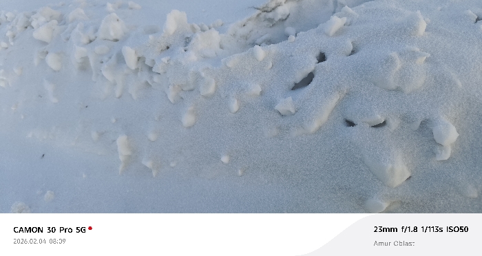 A close-up view captures a snowdrift, composed of snow with variable textures. The upper layer features jagged edges, while the bottom displays finer, softer details, possibly indicating different degrees of compaction. Small holes perforate the snowpack, adding depth. In the lower part of the image, camera information indicates a "CAMON 30 Pro 5G" used with 23mm f/1.8, 1/113s, ISO 50 settings on "2026.02.04 08:09" in Amur Oblas:.