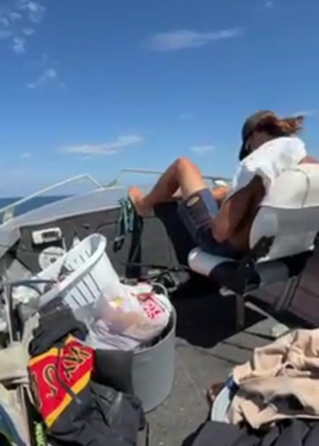 person sitting in a boat, with their feet propped up on the dashboard. The boat is filled with various items, including a laundry basket, clothes, and other gear. The person is wearing shorts, a hat, and a life vest. The sky is blue and the water is calm.