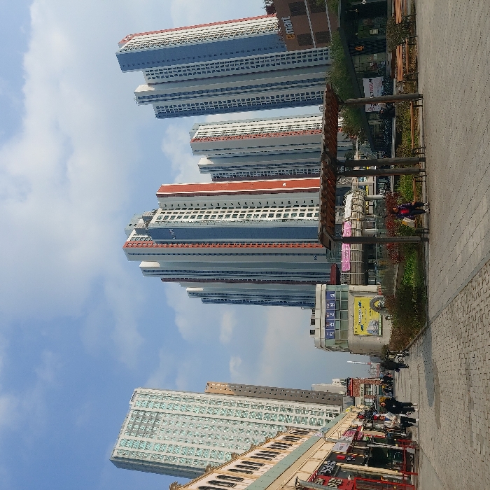 Tall residential buildings stretch towards the sky, painted in alternating shades of blue and white with red accents