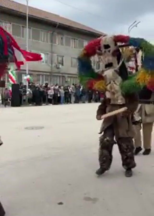 group of people dressed in traditional costumes walking down a street. The costumes are elaborate, with colorful and furry masks that extend high above their heads. The people are walking towards a crowd of onlookers. The street is paved and lined with buildings. The sky is overcast.