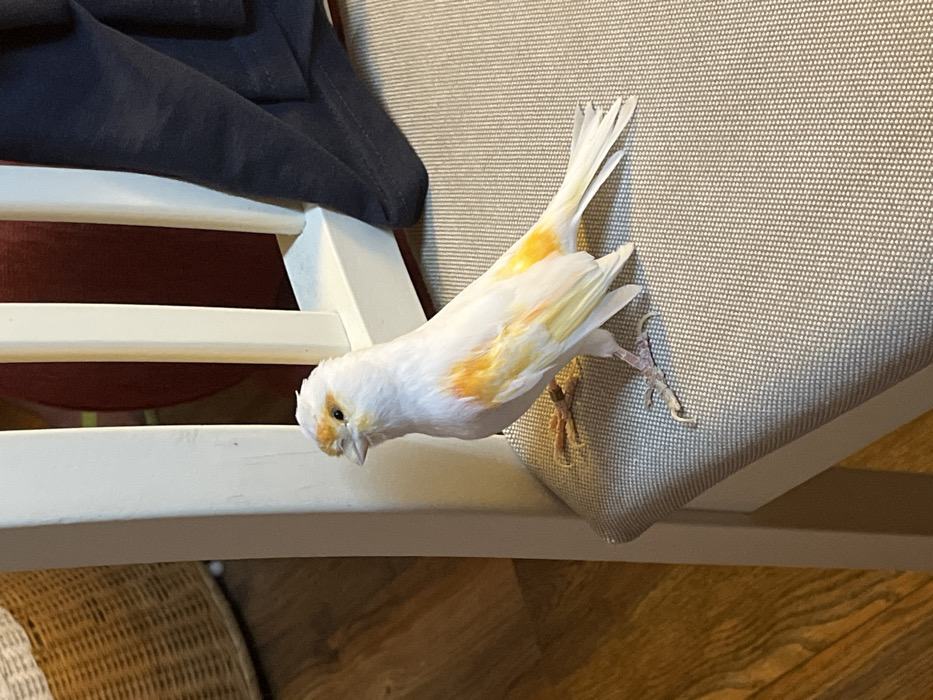 - "The image displays a small domestic bird, identified as a canary, standing on a light gray upholstered chair seat in an indoor environment in Torrent, Spain" by FM-TGq7I2, licensed under CC BY 4.0